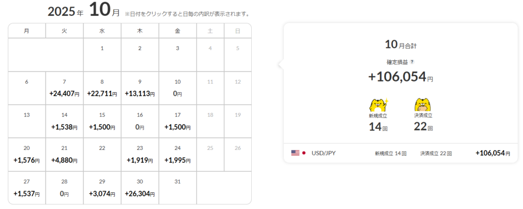 10月のドル円は150円を突破し過去塩漬け状態となっていたポジションが決済され、さらに私の仕掛けに合う値動きもあり素晴らしい成績を出す事ができました。
