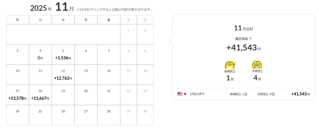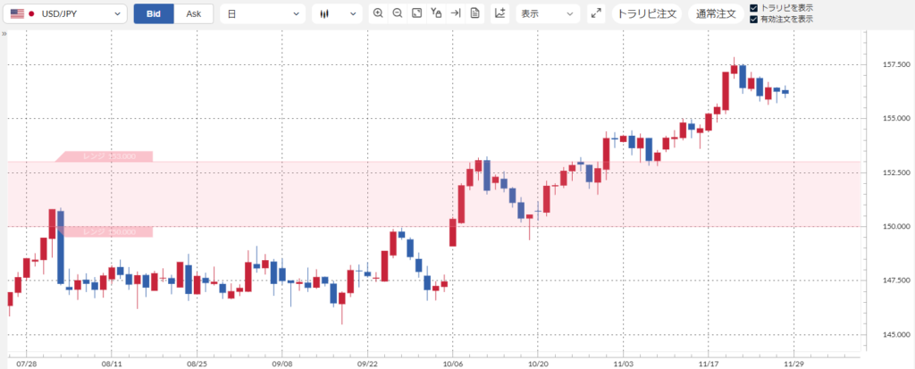 11月のドル円は156円を突破したことから155円で買付していたポジションが決済され現在ポジションはゼロになりました。