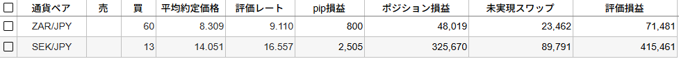 現在、保有しているのはスウェーデンクローナ(SEK/JPY)、南アフリカランド円(ZAR/JPY)です。